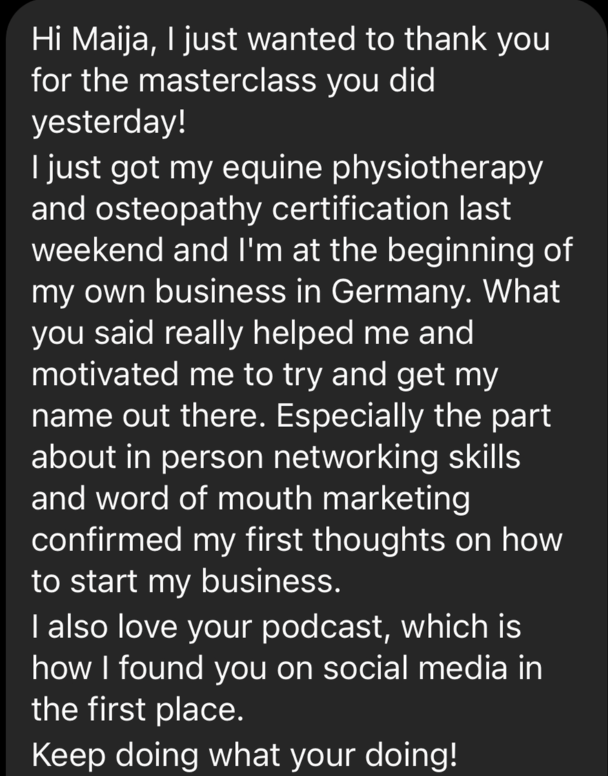 She gave me the push I needed to put myself out there and get my very first clients, which quickly snowballed into a thriving business, allowing me to quit the spa job I hated and work for myself full time. I’m so grateful to that business coach, and to the many other business and bodywork mentors I had around me at the time. If I didn’t have them, I wouldn’t be where I am today: living in my dream home, getting to travel the world to work on horses, and feeling fulfilled every day by my work.Â